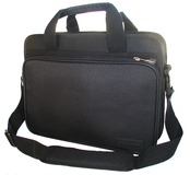 持ち手と取り外し可能なショルダーストラップ付きの黒のナイロンバッグです。Konftel 55シリーズ/300シリーズを収納でき、ポケットにケーブルやアクセサリー製品を入れることができます。外側ポケットはA4サイズの書類が収納可能です。